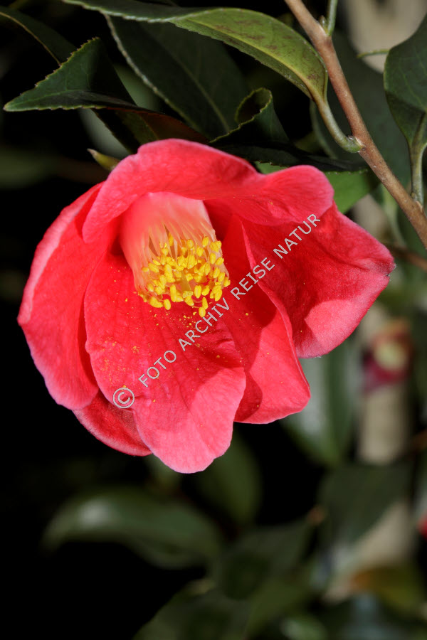 Blume, Farbe, Flora, Kamelie, Camellia japonica, Lago Maggiore, Locarno, Pflanzenteil, Schweiz, Teestrauchgewächs, Tessin, rot,