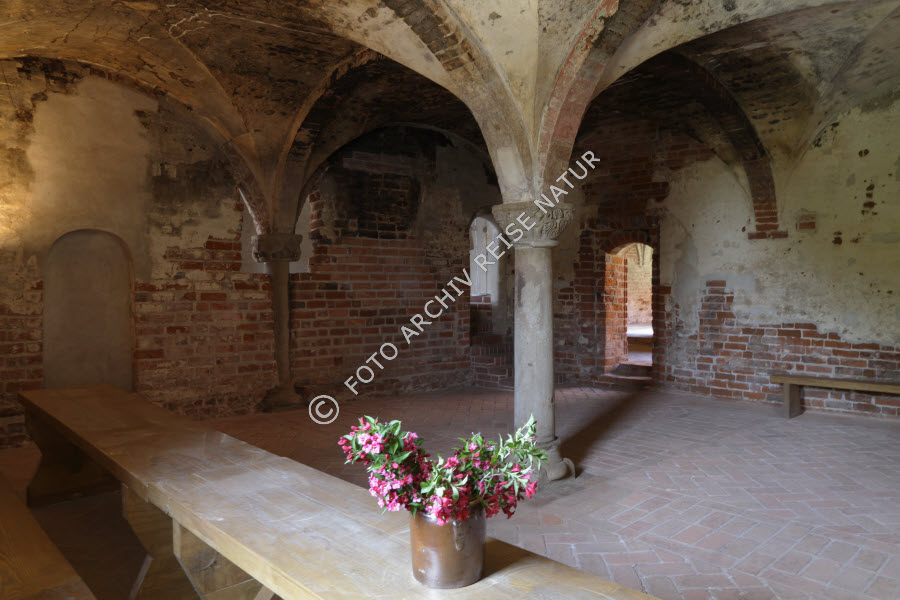 Abtei, Kloster, Backstein, Backsteinkirche, Baustil, Bauwerk, Deutschland, Gebäude, Gebäudeteil, Gewölbe, Jerichow, Kapitell, Kirche, Klosterkirche, Kreuzgewölbe, Material, Refektorium, Romanik, Sachsen-Anhalt, Sakralbau, Stein, Steinkirche, Säule,