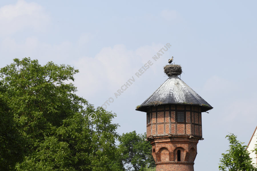 Backstein, Baum, Bauwerk, Dach, Deutschland, Fachwerk, Fauna, Flora, Gebäudeteil, Material, Mauer, Nest, Rühstäd, Sachsen-Anhalt, Schindeldach, Stein, Storchennest, Störche, Tierbau, Turm, Vogel, Wasserturm, Weißstorch, Ciconia ciconia,