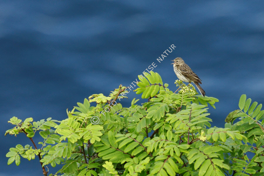 Fauna, Flora, Goksøyr, Insel, Insel Runde, Landschaft, Møre og Romsdal, Norwegen, Rosengewächs, Stelzen und Pieper, Strandpieper , Anthus petrosus, Vogel, Vogelbeere, Sorbus aucuparia,