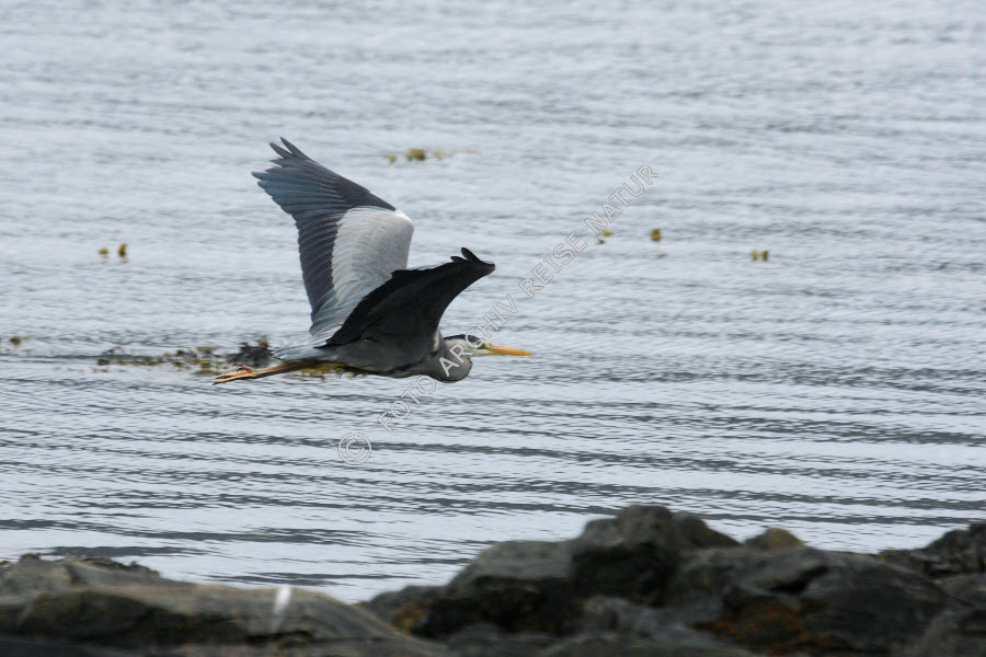 Algen, Bewegen, Ereignis, Fauna, Felsküste, Fliegen, Flora, Geschehen, Graureiher, Ardea cinera, Insel, Insel Runde, Küste, Landschaft, Møre og Romsdal, Norwegen, Reiher, Seetang, Tätigkeit, Vogel,