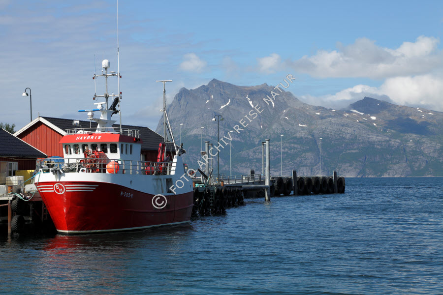 Bauwerk, Berg, Bergrücken, Bergspitze, Farbe, Felsküste, Fischereihafen, Fischerhütte, Fjord, Fährhafen, Gebäude, Gewässer, Hafen, Hütte, Kilboghamn, Küste, Landschaft, Mole, Nordland, Norwegen, Sørfjorden, blau, rot,