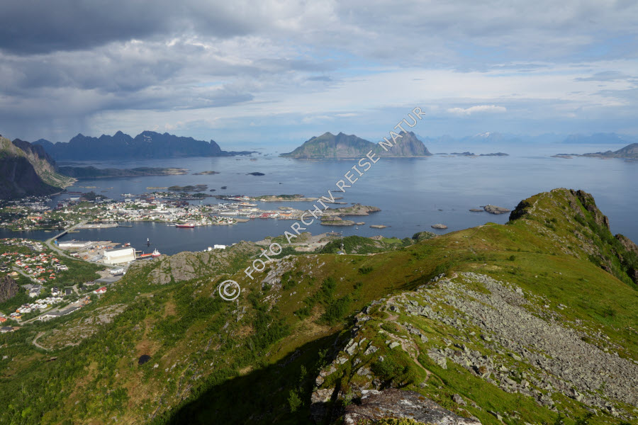 Austvågøya, Bauwerk, Berg, Bergrücken, Felseninsel, Fjord, Gewässer, Grat, Insel, Landschaft, Lofoten, Nordland, Norwegen, Pfad, Schäre, Stormolla, Svolvær, Tjeldbergtinden, Verkehrsweg, Vestfjorden, Wanderweg, Weg,