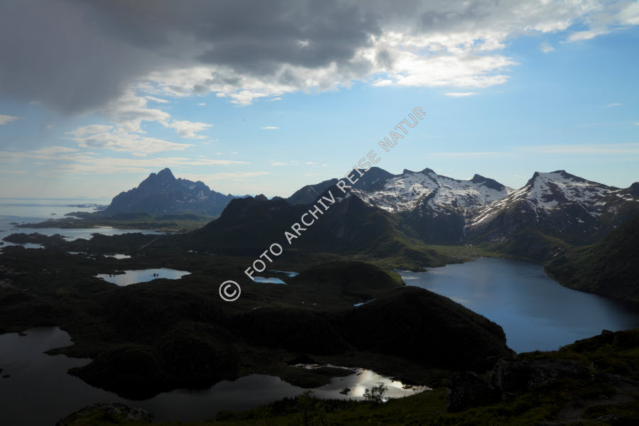 Austvågøya, Berg, Bergkette, Bergsee, Gebirge, Gewässer, Kabelvåg, Landschaft, Licht, Lichtreflex, Lofoten, Nordland, Norwegen, Reflexion, See, Tjeldbergtinden, Wald,