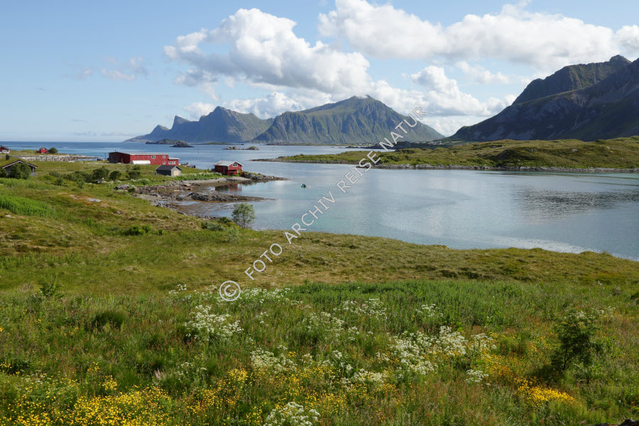 Bauwerk, Bergkette, Blume, Fischerhütte, Flora, Fredvang, Frühsommerwiese, Gebirge, Gebäude, Gewässer, Hütte, Landschaft, Lofoten, Meer, Moskenesøy, Nordland, Nordmeer, Norwegen, Rorbu, Strand, Wiese, Wiesenstrand,
