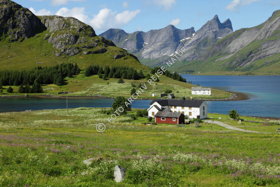 Bauernhof, Bauwerk, Berg, Berghang, Fahrweg, Felsen, Felshang, Fichtenwald, Fjord, Fredvang, Gebäude, Gehöft, Gewässer, Haus, Hof, Holzhaus, Kulturlandschaft, Landschaft, Lofoten, Material, Moskenesøy, Nadelwald, Nordland, Norwegen, Stein, Torsfjorden, Verkehrsweg, Wald, Weg, Weide, Wiese, Wiesenhang,