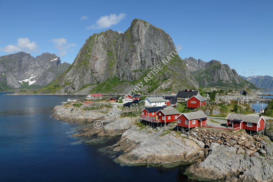 Bauwerk, Berg, Bergspitze, Farbe, Felsen, Felsklippe, Felswand, Fischerhütte, Fjord, Gebäude, Gewässer, Gipfel, Hamnøy, Haus, Holzhaus, Hütte, Landschaft, Lofoten, Material, Moskenesøy, Nordland, Norwegen, Olstinden, Pfahlbau, Reinefjorden, Rorbu, Stein, Vorfjorden, blau, rot,