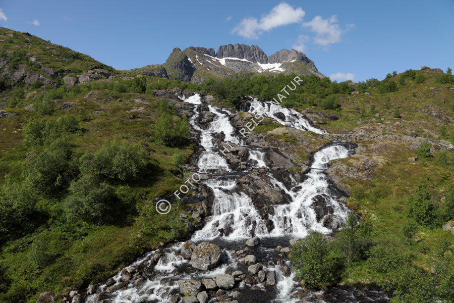 Bergwiese, Felsbrocken, Felsen, Felshang, Gewässer, Landschaft, Lofoten, Material, Moskenesøy, Nordland, Norwegen, Stein, Sørvågen, Wasserfall, Wiese, Wiesenhang,