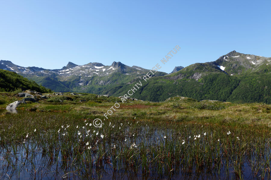 Austvågøya, Berg, Berghang, Bergkette, Felsbrocken, Felsen, Flora, Gebirge, Gewässer, Gras, Grasbüschel, Landschaft, Lofoten, Material, Moortümpel, Nordland, Norwegen, Sauergrasgewächs, Schmalblättriges Wollgras, Eriophorum angustifolium, Sildpollen, Stein, Tümpel,