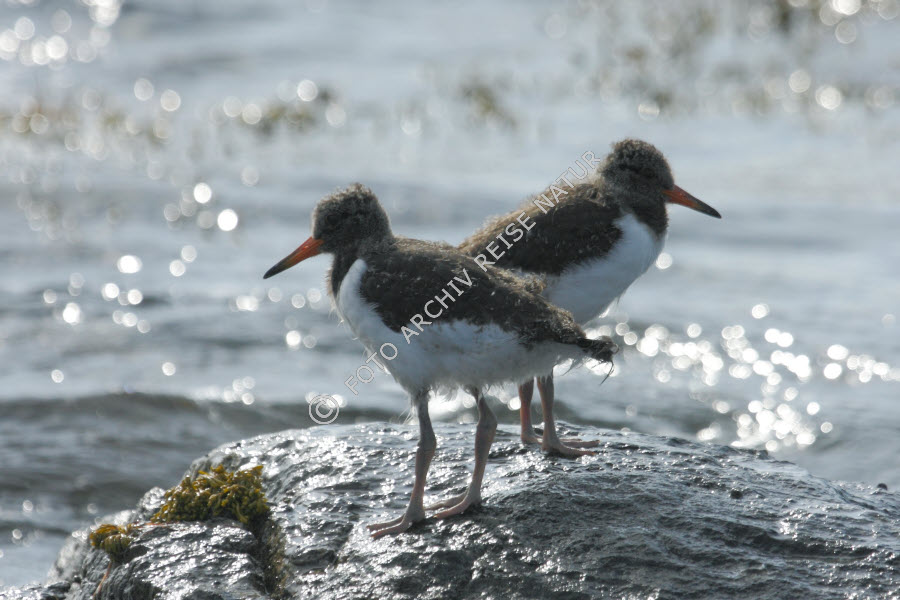 Austernfischer, Haematopus ostralegus, Fauna, Felsenstrand, Flakstad, Flakstadøy, Jungtier, Küste, Landschaft, Licht, Lichtreflex, Lofoten, Nordland, Norwegen, Reflexion, Strand, Vogel, Watvogel,