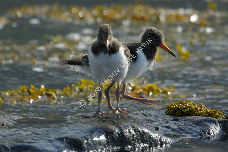 Algen, Austernfischer, Haematopus ostralegus, Blasentang, Fucus vesiculosus, Fauna, Felsenstrand, Flakstad, Flakstadøy, Flora, Jungtier, Küste, Landschaft, Lofoten, Nordland, Norwegen, Seetang, Strand, Vogel, Watvogel,