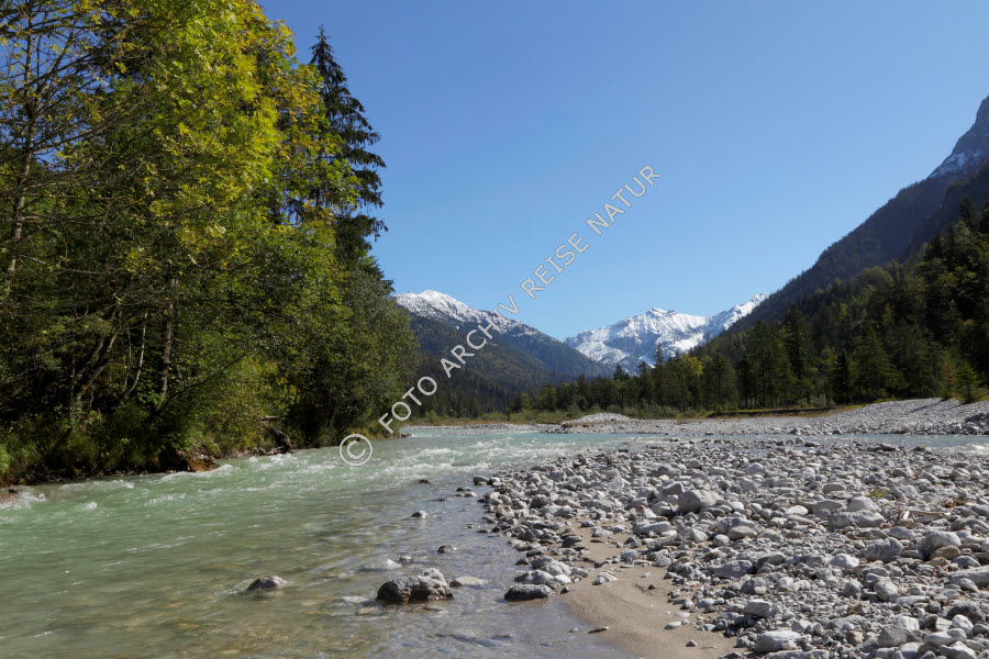 Bach, Baum, Bergkette, Bergwald, Felsen, Flora, Flussgeröll, Gebirge, Gebirgsbach, Geröll, Gewässer, Hinterriss, Karwendel, Landschaft, Material, Stein, Tirol, Vomp, Wald, Waldrand, Österreich,