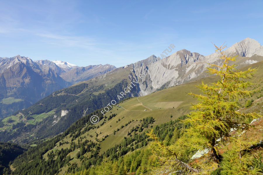 Alm, Baum, Berg, Bergkette, Bergwald, Bergwiese, Cimaross, Farbe, Flora, Gebirge, Kals am Großglockner, Kieferngewächs, Kulturlandschaft, Landschaft, Lärche, Larix, Tirol, Venediger Gruppe, Wald, Weide, Wiese, Wiesenhang, bunt, gelb, Österreich,