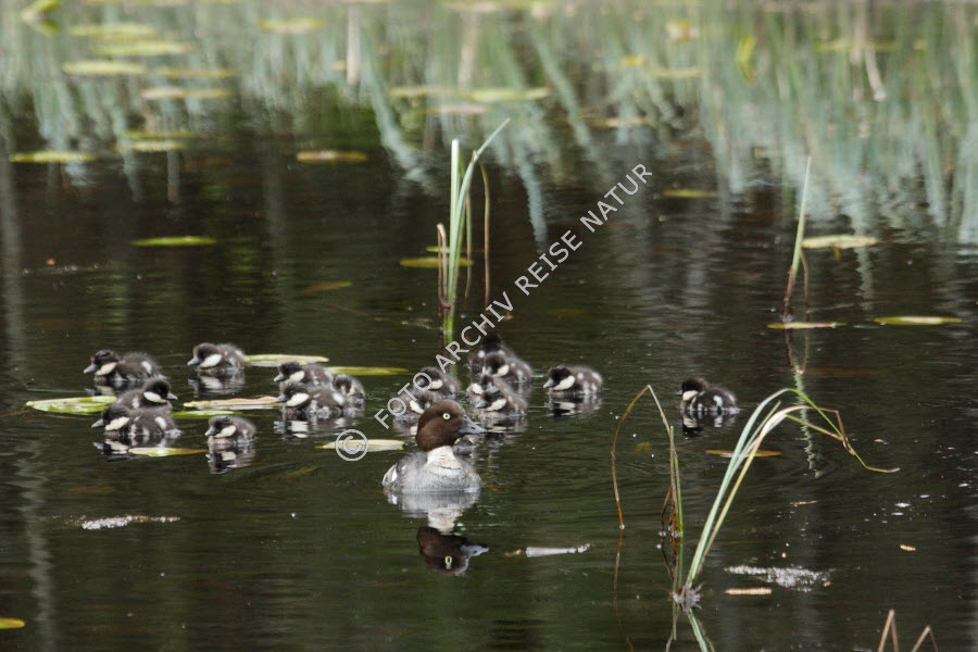 Entenküken, Entenvögel, Fauna, Flora, Gewässer, Gras, Landschaft, Schellente, Bucephala clangula, Schilfrohr , Phragmites australis, See, Süßgras, Vogel, Åsnen,