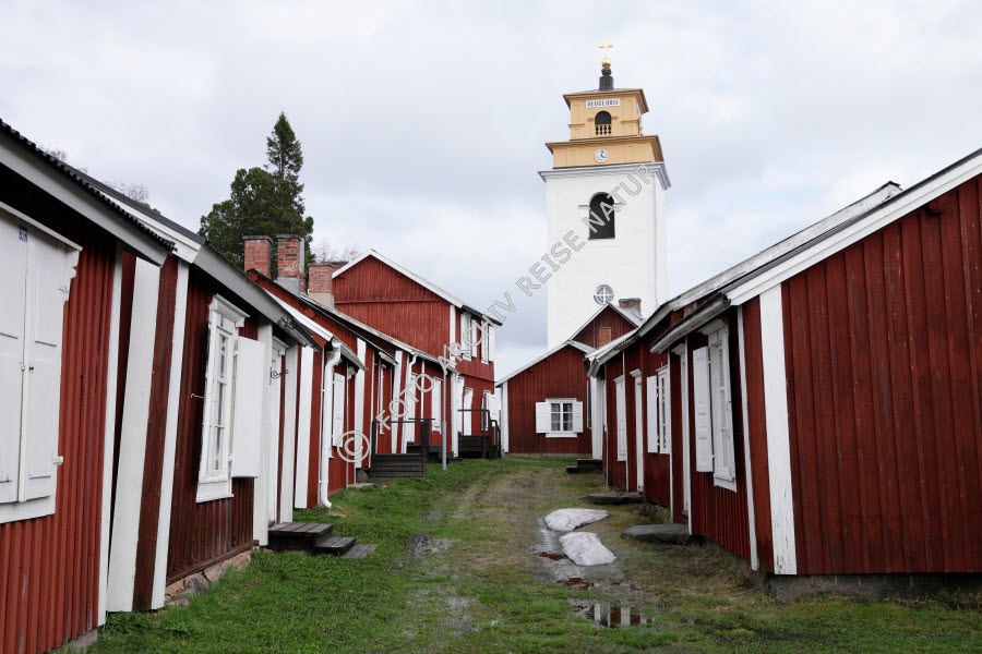 Gasse in Gammelstad mit der Nederluleå Kirche