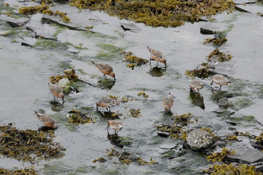 Algen, Barentssee, Blasentang, Fucus vesiculosus, Brandungsgeröll, Ekkerøy, Fauna, Felsen, Finnmark, Flora, Geröll, Geröllstrand, Gewässer, Knutt, Calidris canutus, Landschaft, Lappland, Material, Meer, Norwegen, Schnepfenvogel, Seetang, Stein, Strand, Varanger, Vogel, Watvogel,