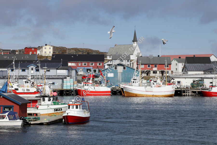 Bauwerk, Berlevåg, Boot, Bootshaus, Fahrzeug, Finnmark, Fischerboot, Fischereihafen, Fischkutter, Gebäude, Hafen, Hafenmauer, Haus, Holzkirche, Kai, Kirche, Kirchturm, Lagerhaus, Lappland, Norwegen, Sakralbau, Speicher, Turm, Varanger, Verkehrsmittel, Wasserfahrzeug,