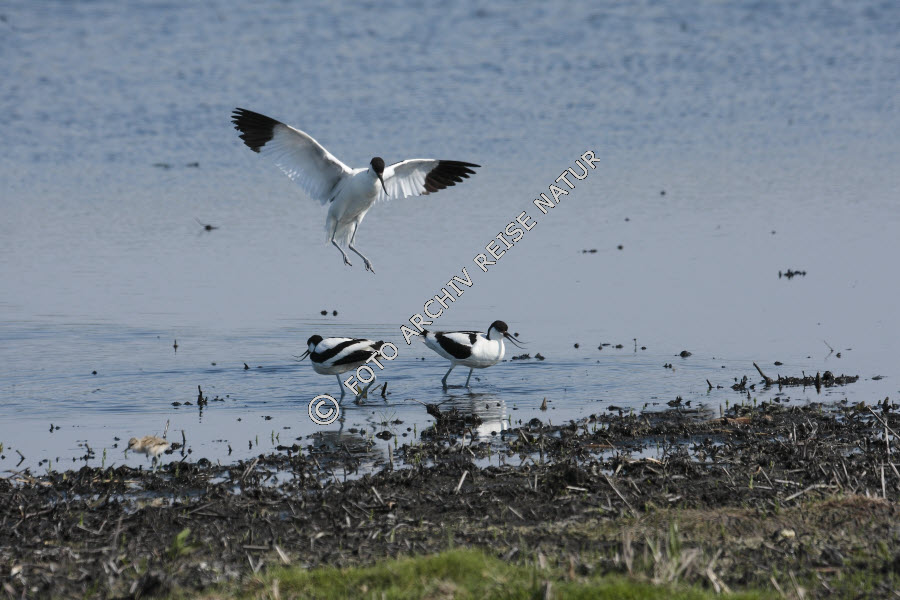 Bodden, Fauna, Flommen Naturreservat, Gewässer, Gruppe, Jungtier, Jungvogel, Küken, Landschaft, Naturschutzgebiet, Ort, Paar, Schweden, Skanör-Falsterbo, Skåne, Säbelschnäbler, Recurvirostra avosetta, Vogel,