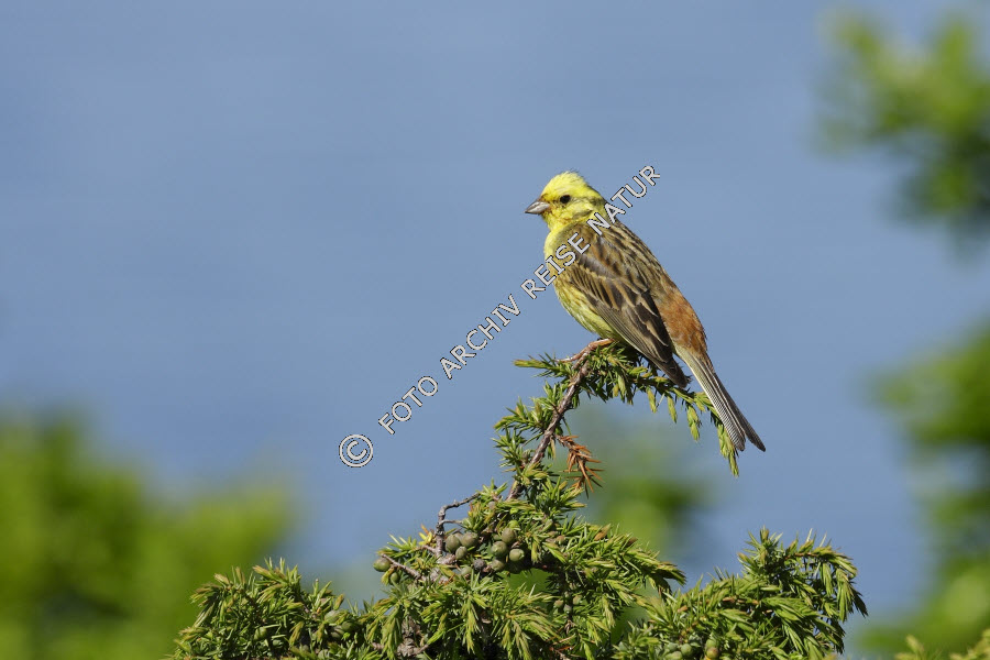 Ammern, Baum, Fauna, Flora, Goldammer, Emberiza citrinella, Kivik, Nationalpark, Ort, Schweden, Skåne, Stenshuvud, Vogel, Wacholder Juniperus, Zypressengewächs,