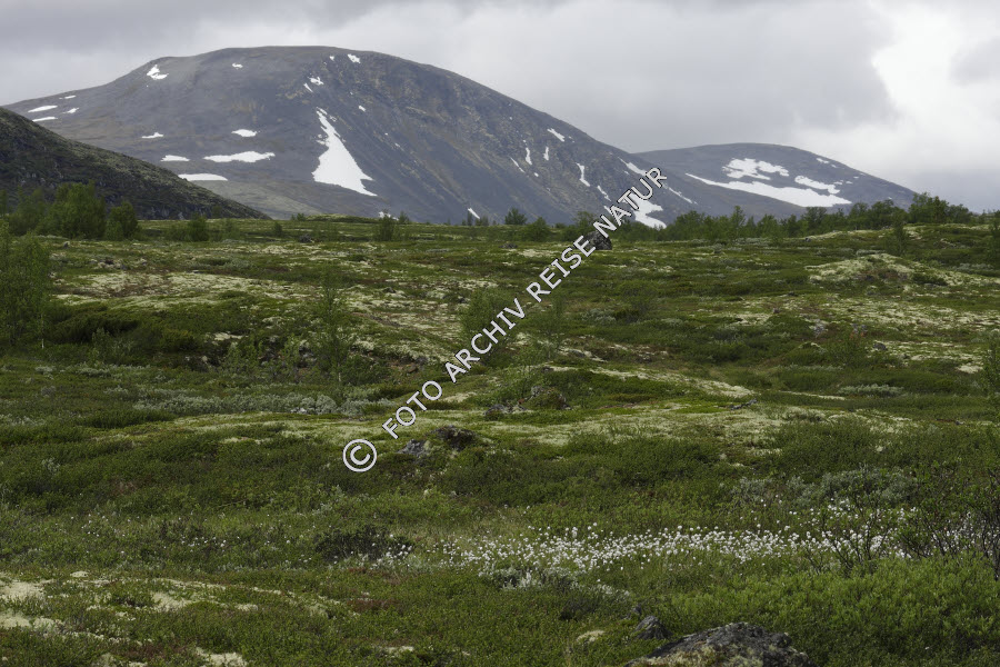 Bergkette, Dovre Fjell, Flechte, Lichen, Flora, Gebirge, Gras, Hjerkinn, Landschaft, Norwegen, Oppland, Rentierflechte, Cladonia rangiferina, Sauergrasgewächs, Schmalblättriges Wollgras, Eriophorum angustifolium,
