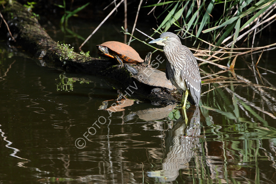Bolle di Magadino, Europäische Sumpfschildkröte, Emys orbicularis, Fauna, Gewässer, Jungtier, Jungvogel, Lago Maggiore, Landschaft, Nachtreiher, Nycticorax nycticorax, Naturschutzgebiet, Ort, Reiher, Schildkröte, Schweiz, Teich, Tessin, Ticino Bolle, Ufer, Uferböschung, Vogel,