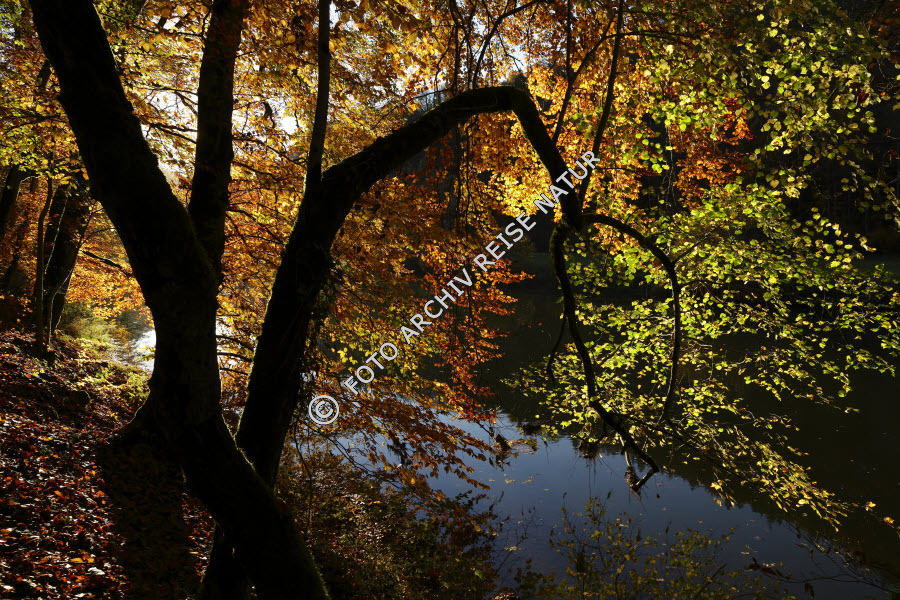 Baden-Württemberg, Baum, Baumstamm, Deutschland, Donau, Farbe, Flora, Fluss, Fridingen, Gewässer, Landschaft, Laubwald, Naturpark, Obere Donau, Ort, Wald, bunt,