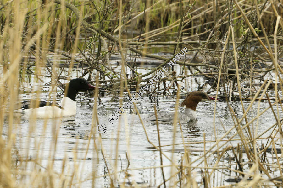 Brutpaar, Entenvögel, Fauna, Flora, Gewässer, Gras, Gruppe, Gänsesäger, Mergus merganser, Hornborgasjön, Landschaft, Naturschutzgebiet, Ort, Paar, Reet, Schilfrohr , Phragmites australis, See, Süßgras, Vogel,