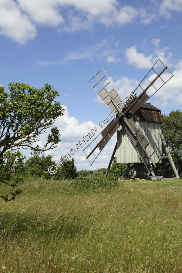 Bauwerk, Blütenstrauch, Bockmühle, Flora, Frühsommerwiese, Gebäude, Himmel, Holunder, Sambucus, Landschaft, Mühle, Strauch, Wiese, Wiesenhang, Windmühle,