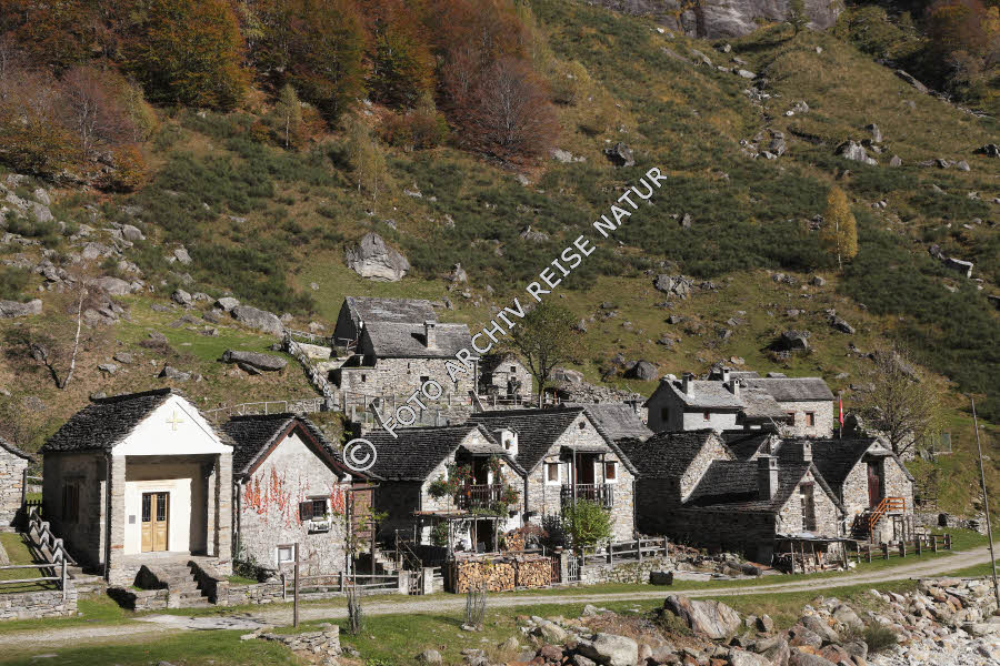 Bauwerk, Bergdorf, Berghütte, Bergwald, Dach, Dorf, Farbe, Gebäude, Gebäudeteil, Gehöft, Granitdach, Granitmauer, Haus, Hochtal, Hof, Hütte, Kapelle, Kirche, Kulturlandschaft, Landschaft, Mauer, Natursteindach, Natursteinhaus, Natursteinkirche, Natursteinmauer, Rustico, Sakralbau, Steinkirche, Tal, Wald, Weiler, bunt,