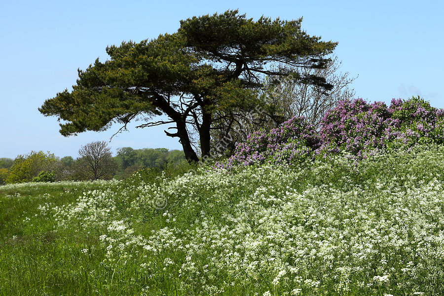 Baum, Blume, Doldenblütler, Flieder, Syringa, Flora, Giersch, Aegopodium podagraria, Kiefer, Pinus, Kieferngewächs, Kulturlandschaft, Naturschutzgebiet, Ort, Ottenby, Schweden, Wiese, Öland, Ölbaumgewächs,