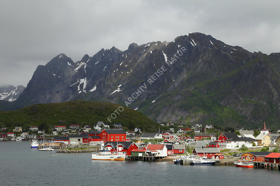 Bauwerk, Berg, Berghang, Bergkette, Bergmassiv, Bergrücken, Bergspitze, Fischereihafen, Fjord, Gebirge, Gewässer, Grat, Hafen, Landschaft, Lofoten, Moskenesøy, Nordland, Norwegen, Pfahlbau, Reine, Reinefjorden,