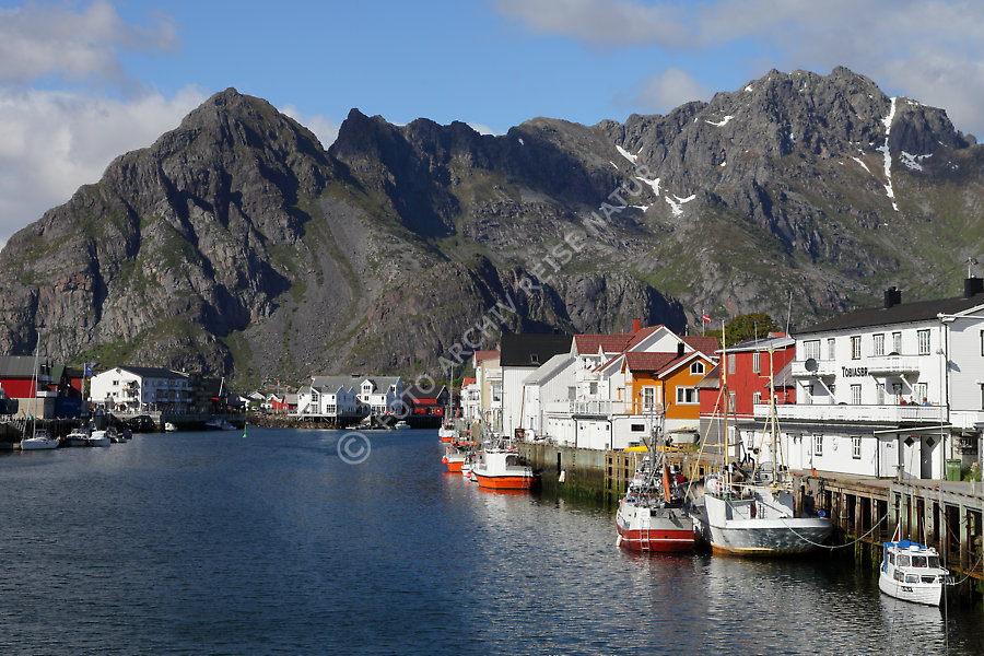 Austvågøya, Bauwerk, Bergmassiv, Dorf, Fischerdorf, Fischereihafen, Gebirge, Hafen, Henningsvær, Kulturlandschaft, Landschaft, Lofoten, Nordland, Norwegen, Pfahlbau,