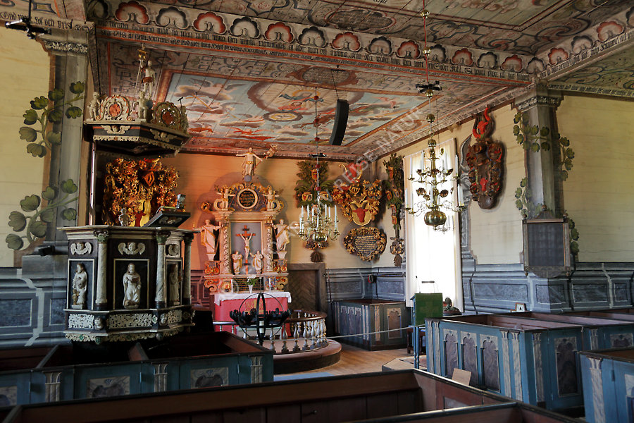 Kirchenschiff mit Altar und Kanzel in der Kirche von Brandstorp