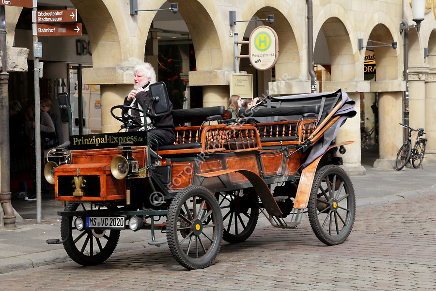 Reiseführer mit Kraftdroschke auf dem Prinzipalmarkt in Münster