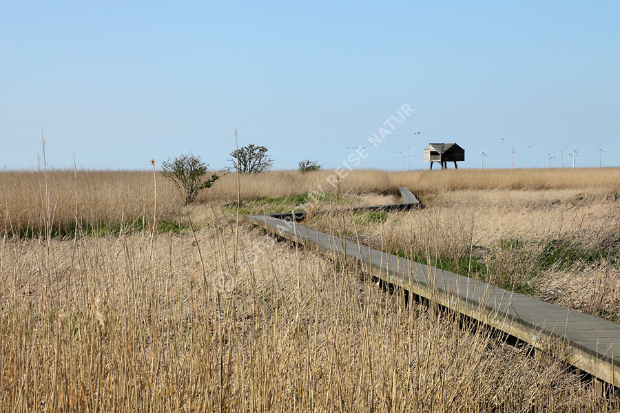 Bauwerk, Beobachtungsturm, Bohlensteg, Dollart, Flora, Gewässer, Gras, Holzsteg, Landschaft, Meer, Niederlande, Nieuwe Statenzijl, Nordsee, Pfad, Reet, Schilfrohr , Phragmites australis, Steg, Süßgras, Turm, Verkehrsweg, Vogelturm, Wanderweg, Weg, Windrad,