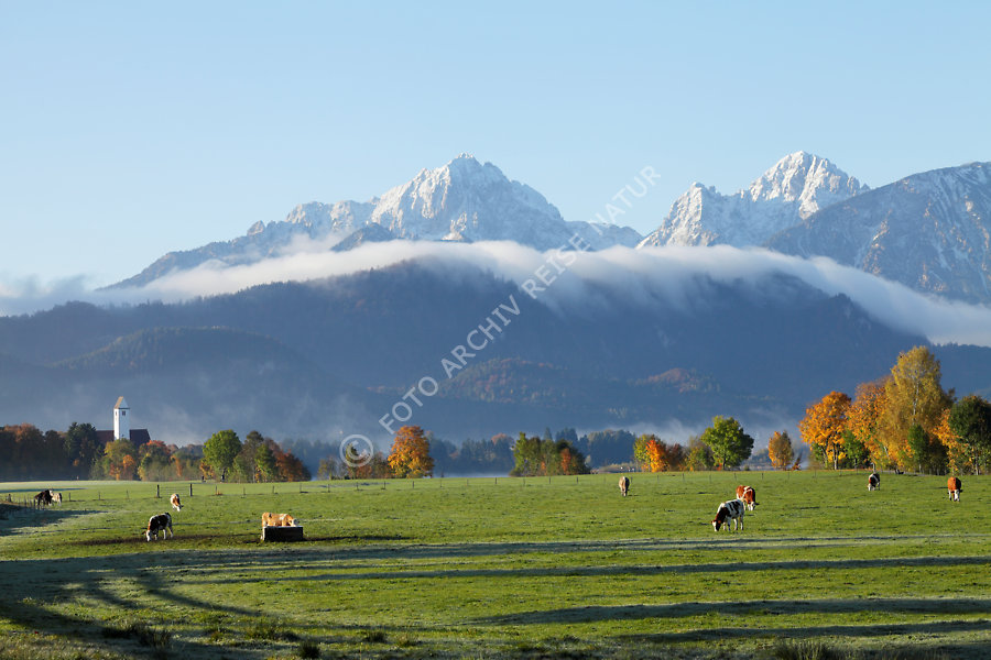 Allgäu, Alpen, Bayern, Berg, Bergkette, Bergspitze, Brunnen, Deutschland, Gebirge, Gipfel, Kulturlandschaft, Landschaft, Schwangau, Weide,