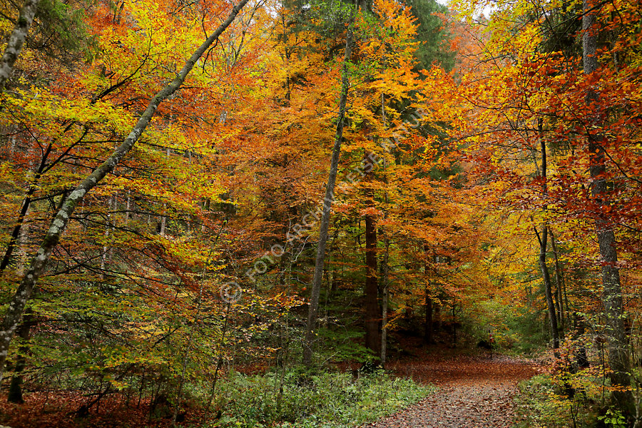 Waldweg durch bunten, herbstlichen Buchenwald