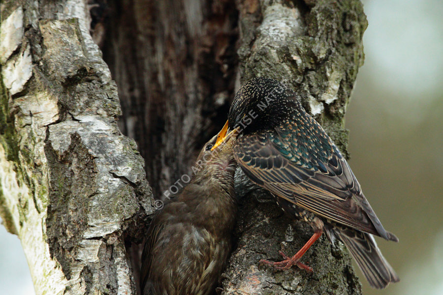 Baum, Baumstamm, Ereignis, Fauna, Flora, Füttern, Geschehen, Höhle, Jungtier, Jungvogel, Landschaft, Star, Sturnus vulgaris, Tätigkeit, Versorgen, Vogel,