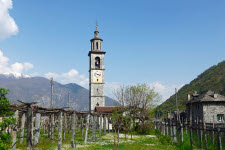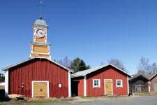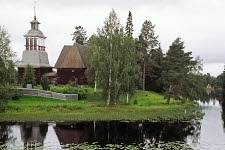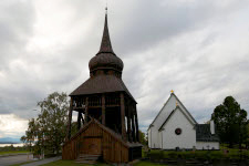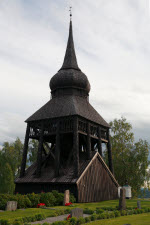 Glockenturm und Frösö kyrka auf Frösön. Kirche aus Stein 12 Jhd. und freistehender Glockenturm aus Holz.