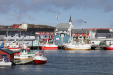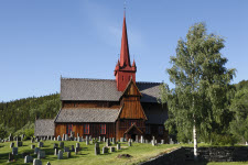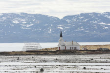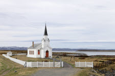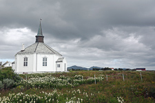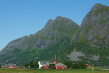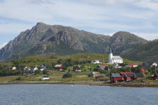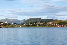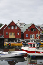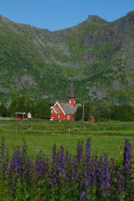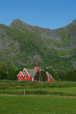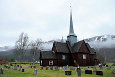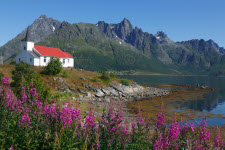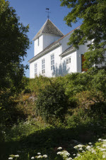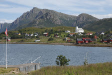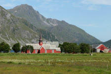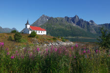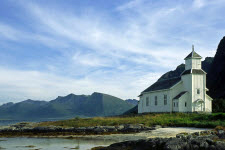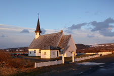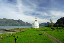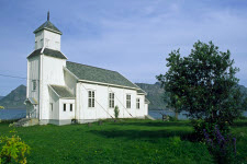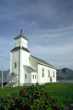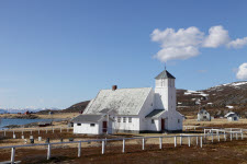 Holzkirche von Gimsøy mit Sturmsicherung aus Stahlseilen