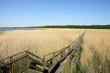 Bohlensteg zum Vogelturm am Kalmarsund bei Beijershamn