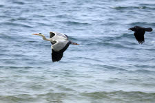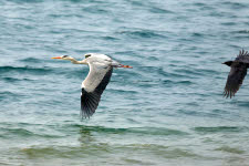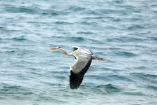 Graureiher fliegt über den Trondheimfjord bei der Insel Tautra